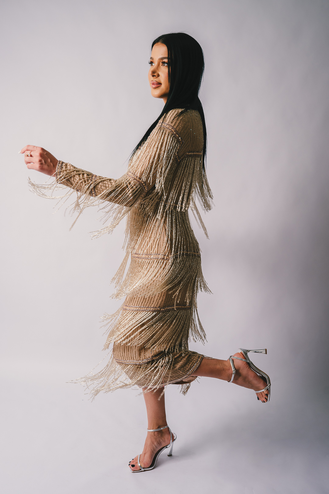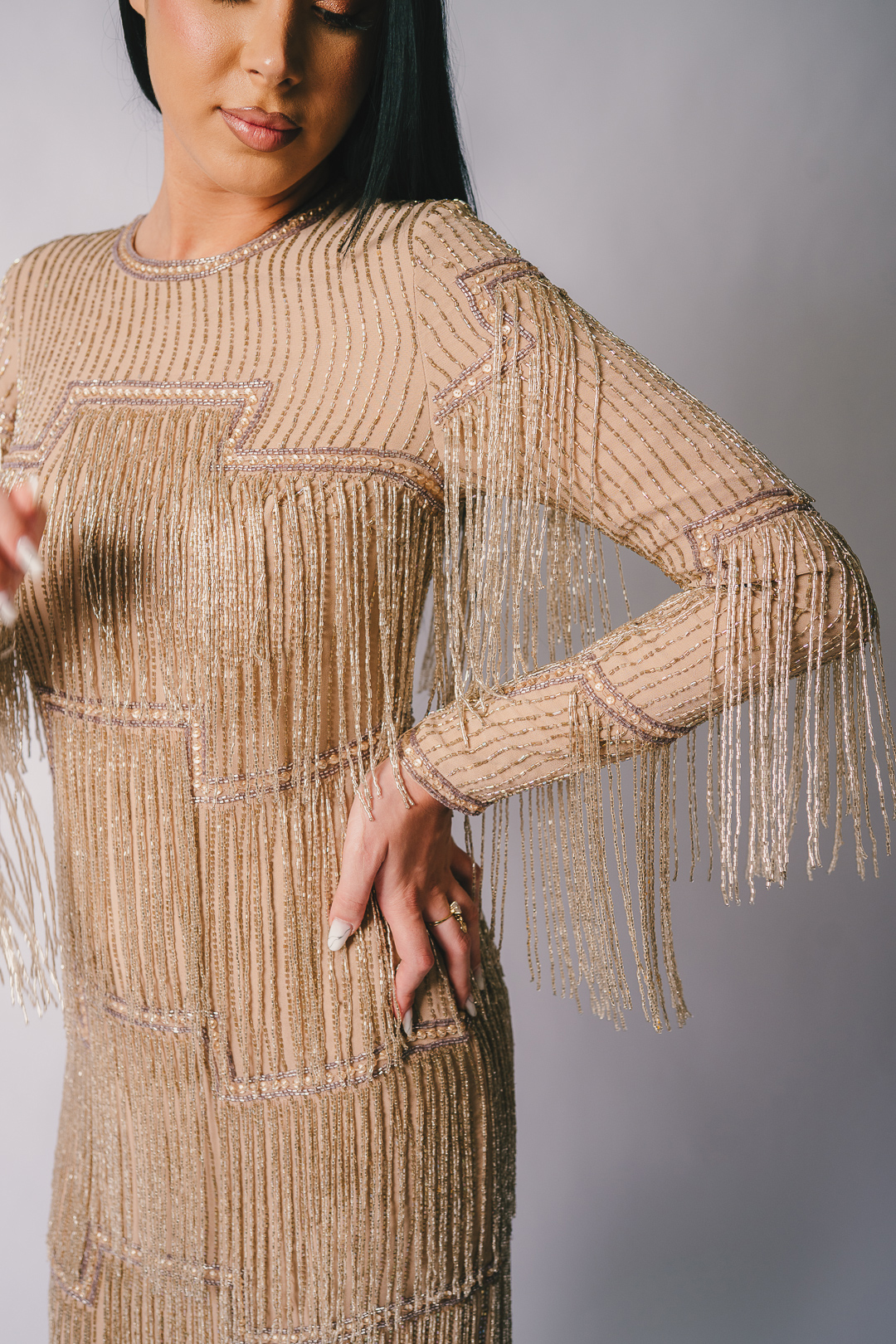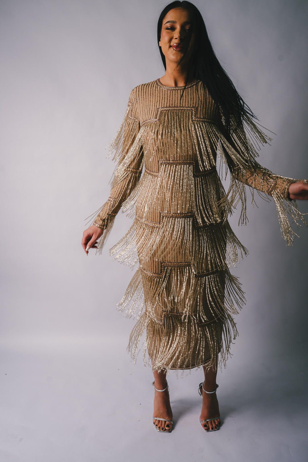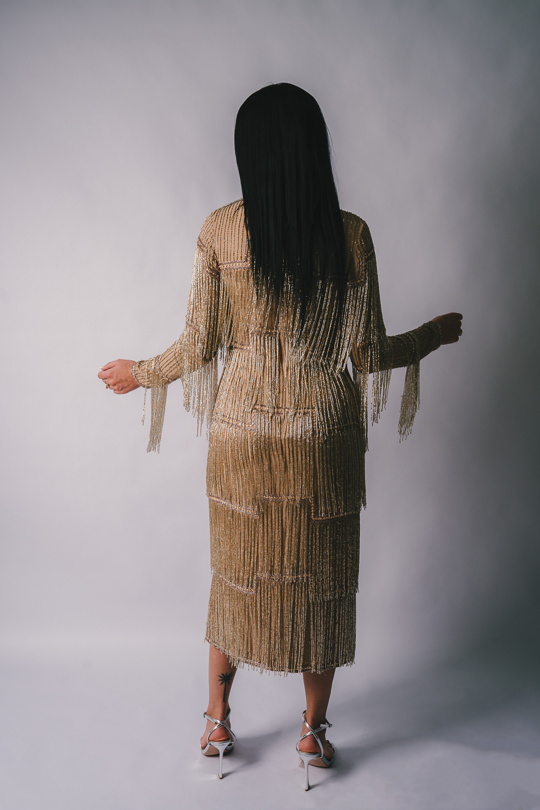 Rochia eleganta aurie cu franjuri este o piesă statement perfectă pentru petreceri glam, evenimente speciale sau seri în care vrei să ieși în evidență. Este confecționată dintr-un material fin, complet acoperit cu franjuri metalic strălucitori, ce se mișcă spectaculos la fiecare pas.