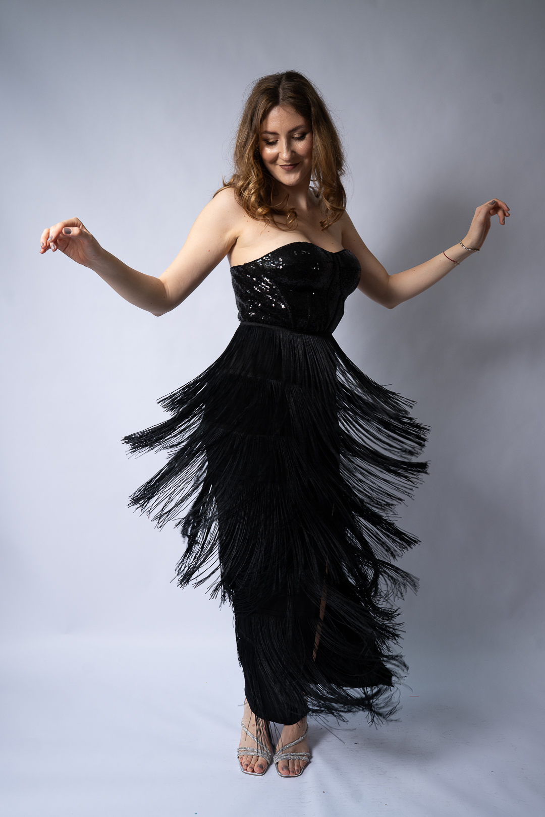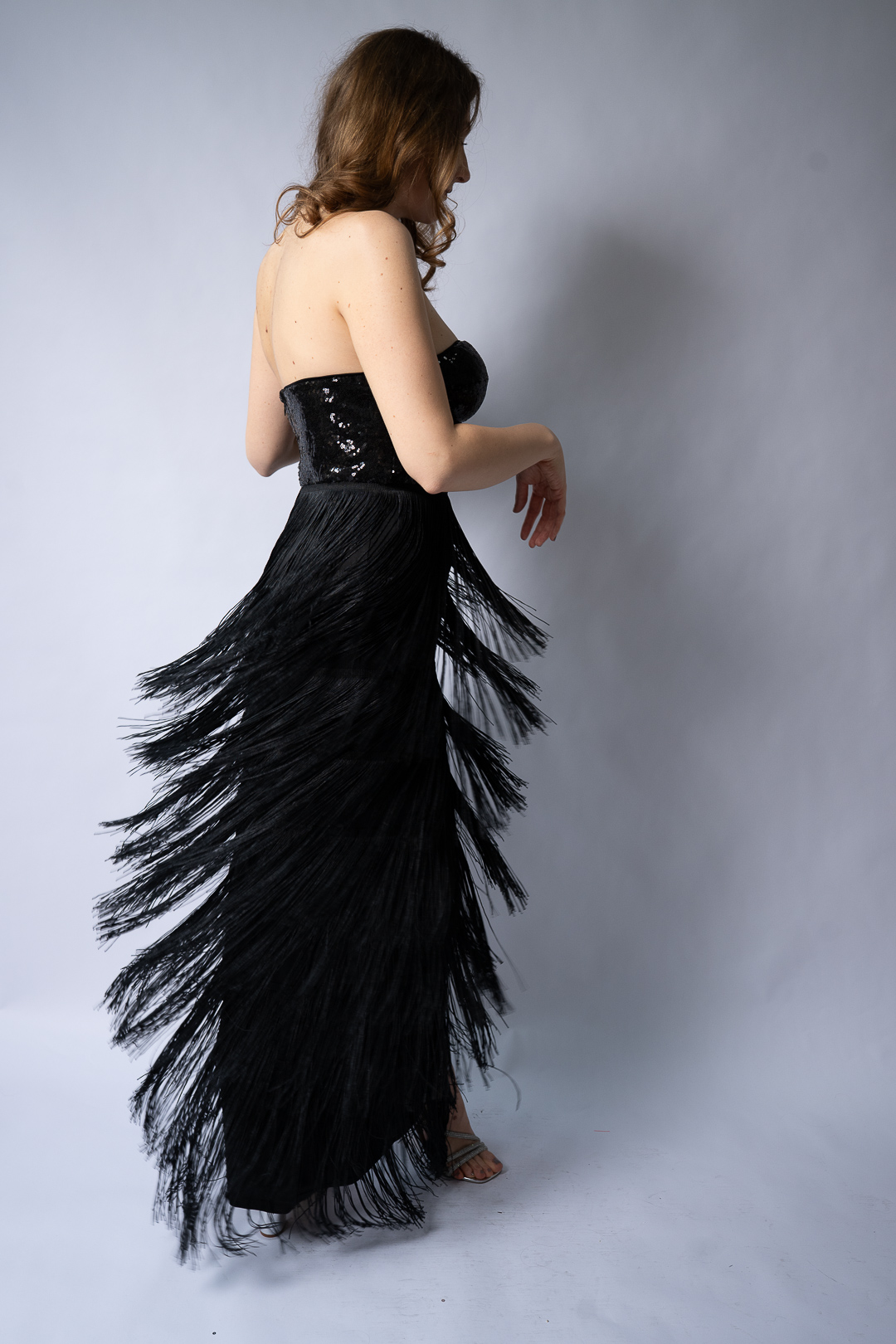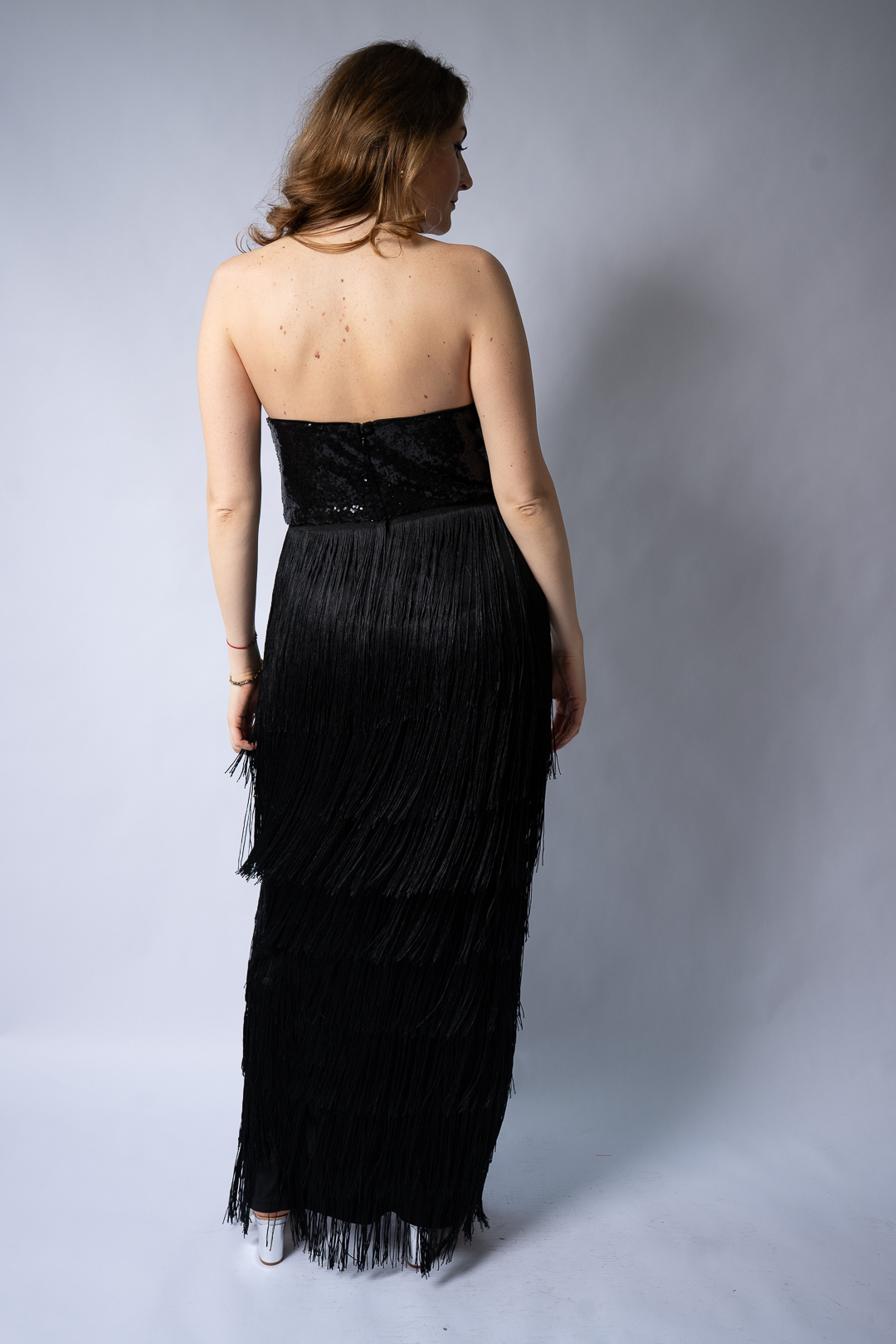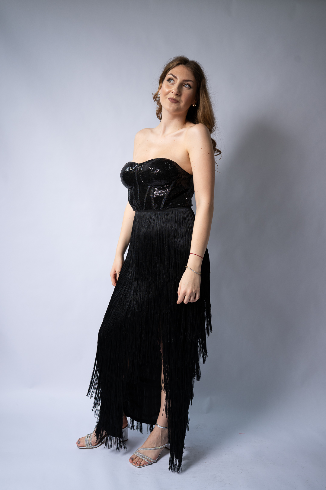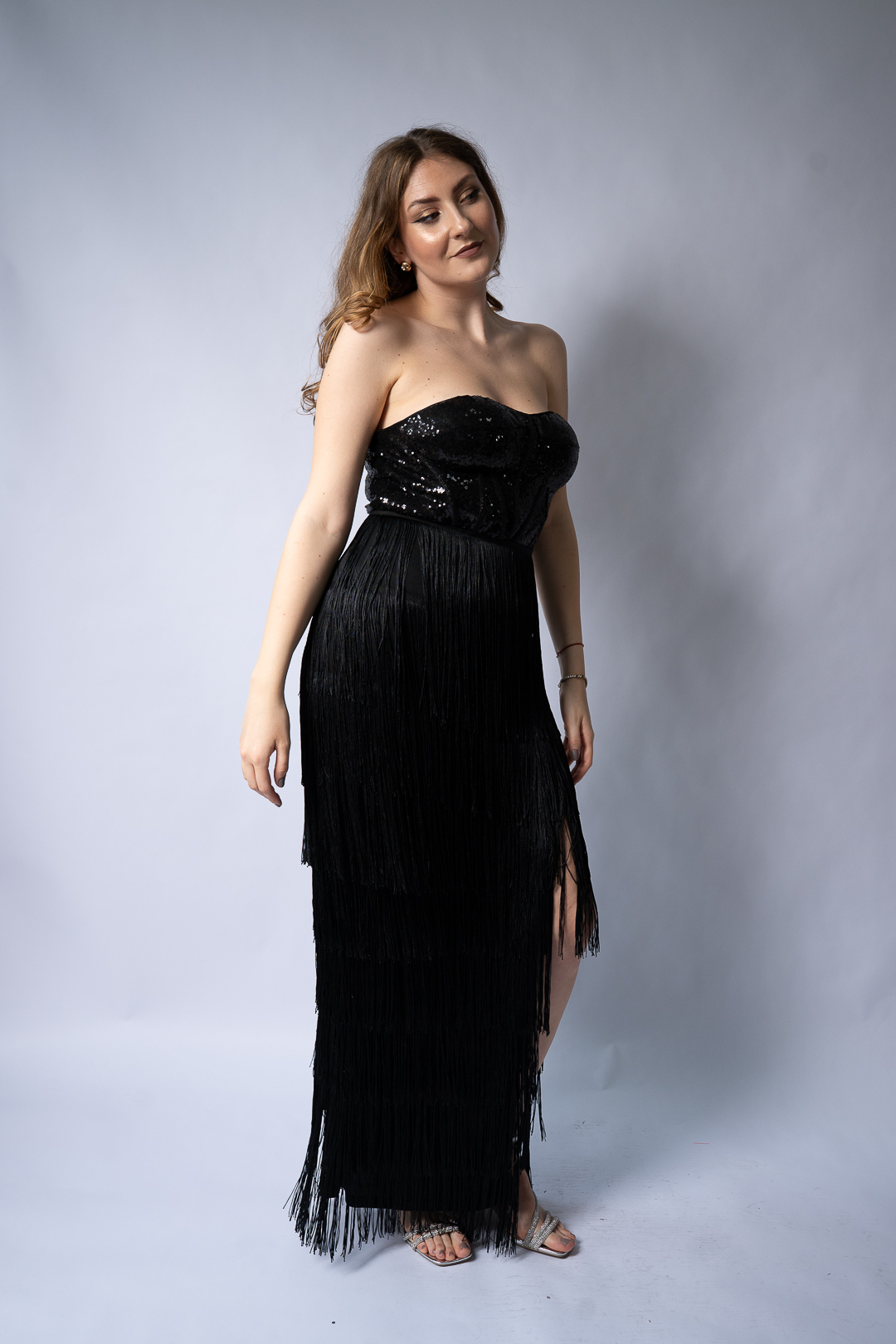 Rochia de seară Dori este un model rafinat și plin de eleganță, ideal pentru evenimente speciale și petreceri. Este o rochie lungă, tip corset, cu partea superioară din paiete negre strălucitoare care îi conferă un aer sofisticat. Partea de jos a rochiei este decorată cu franjuri lungi și fluide, care oferă dinamism și mișcare la fiecare pas. Croiala fără bretele pune în valoare umerii și decolteul, iar lungimea midi adaugă un plus de eleganță.