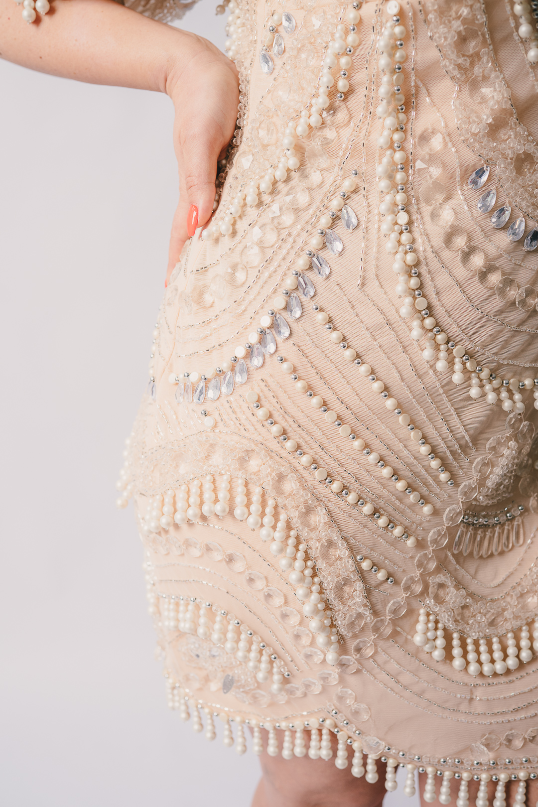 Această rochie bej scurtă este o adevărată piesă de rezistență pentru garderoba oricărei femei care își dorește să strălucească la evenimente speciale.