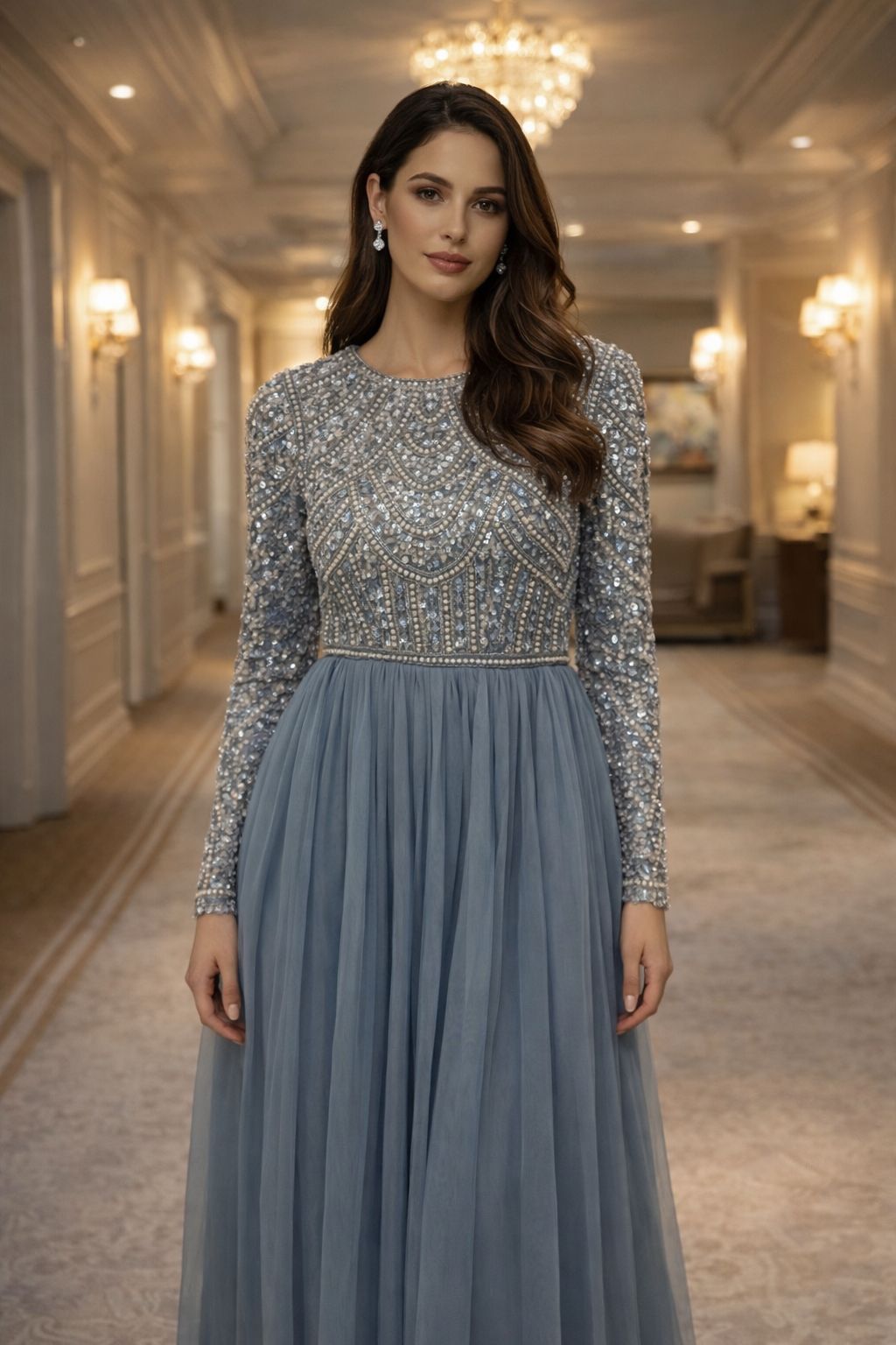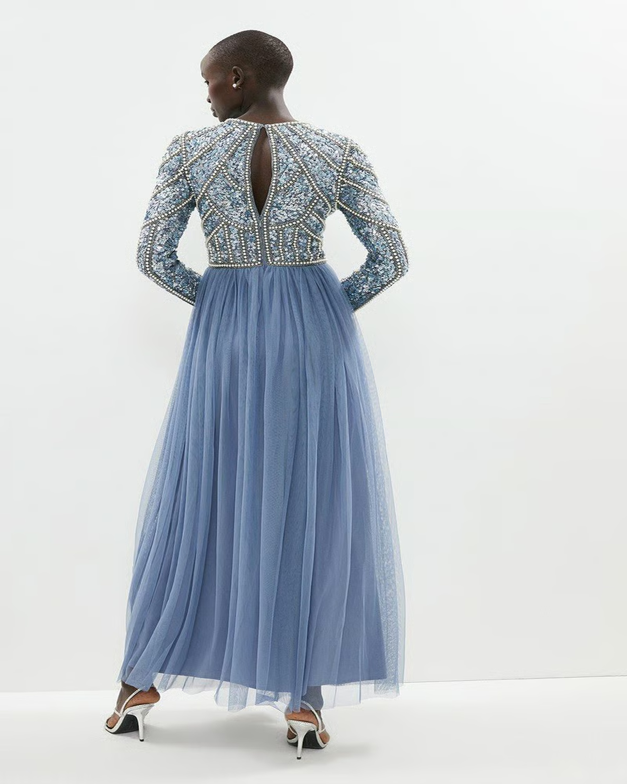 Această rochie elegantă în nuanță sofisticată de albastru-gri impresionează prin detaliile atent lucrate și designul rafinat. Partea superioară este decorată cu broderii fine și aplicații strălucitoare, oferind un efect spectaculos, în timp ce fusta lungă din tulle vaporos creează un look diafan și feminin.