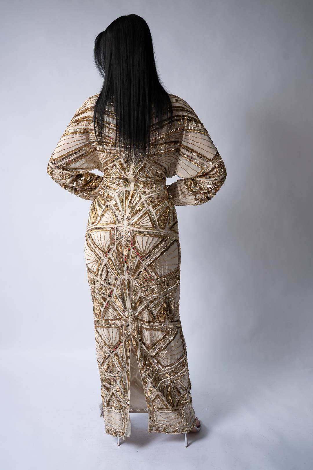 Această rochie lungă emană eleganță și rafinament, ideală pentru ocazii speciale și evenimente deosebite. Realizată dintr-un material delicat și luxos, rochia se distinge prin detalii elaborate, având broderii complexe cu paiete și mărgele aurii, care formează modele geometrice sofisticate. Culoarea predominantă este auriu deschis, cu accente strălucitoare, care reflectă subtil lumina.