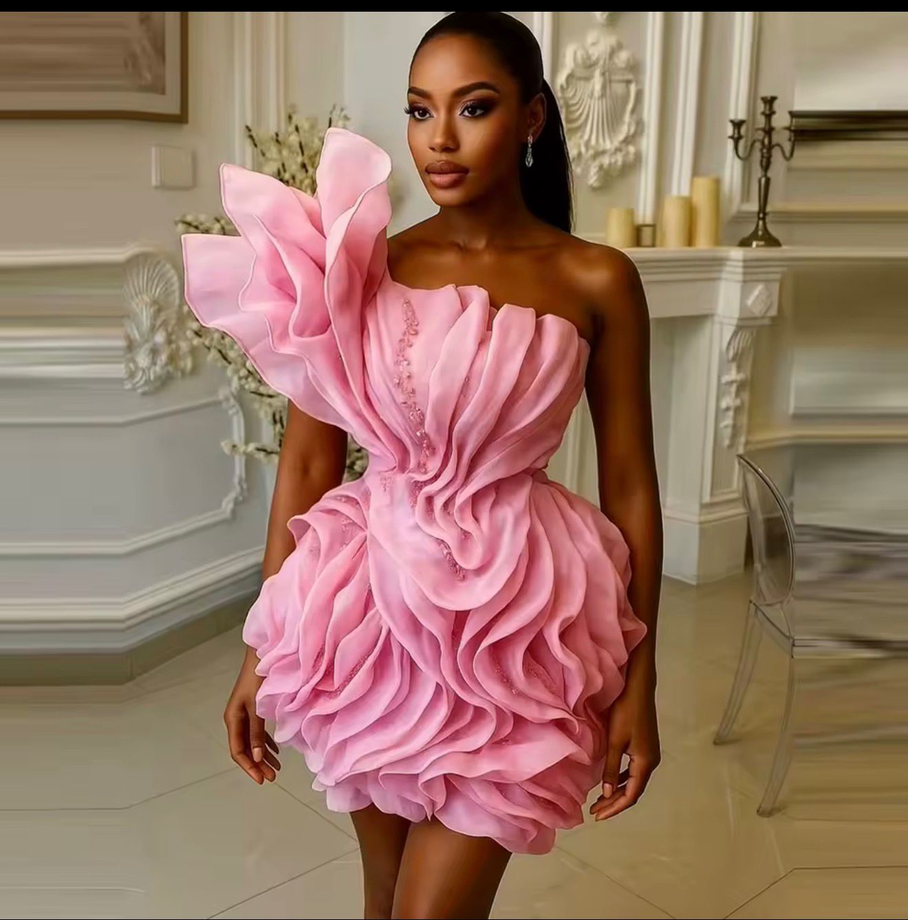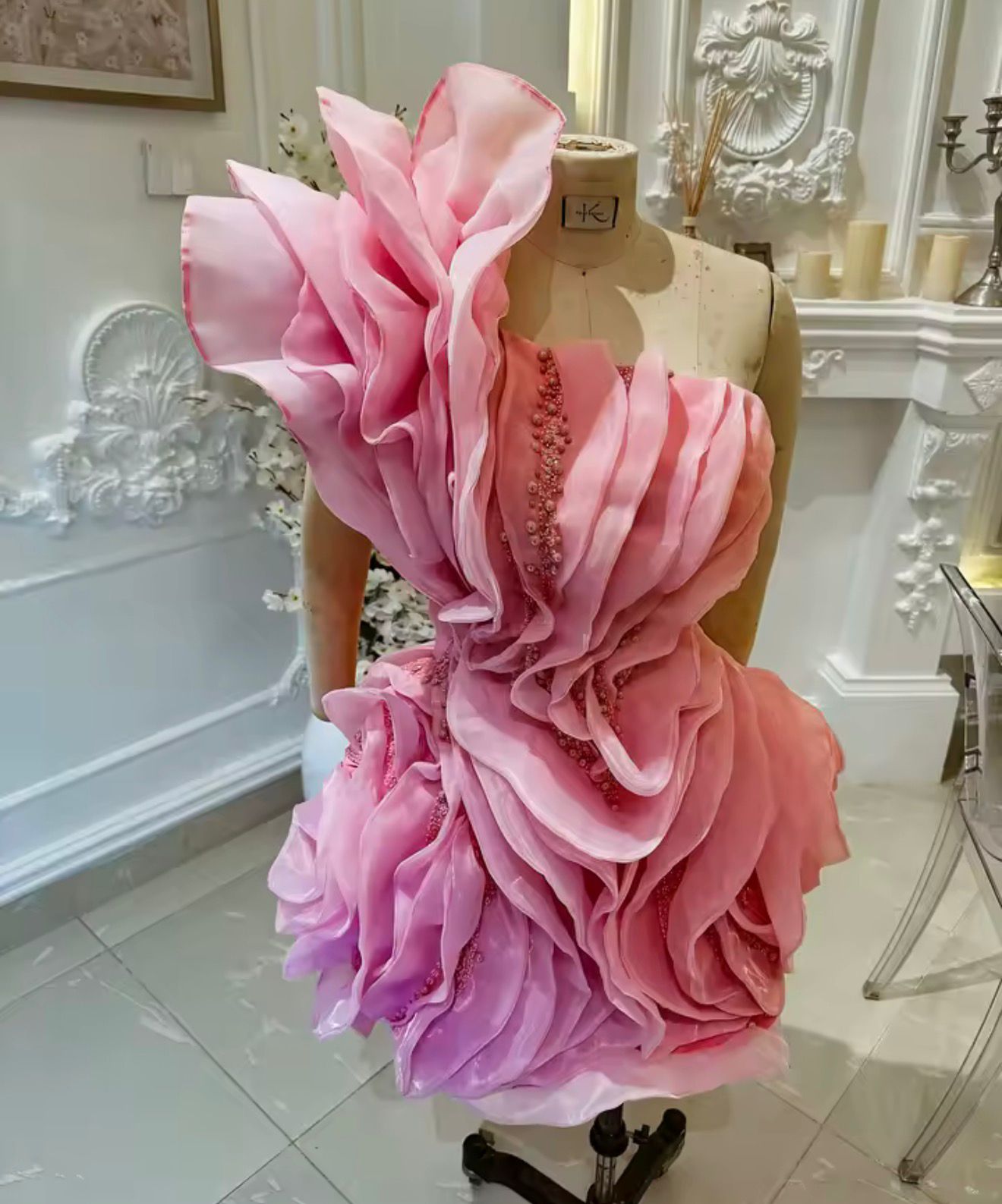 Rochie Pink Blossom Couture – Rochie Scurtă Elegantă cu Volane 3D