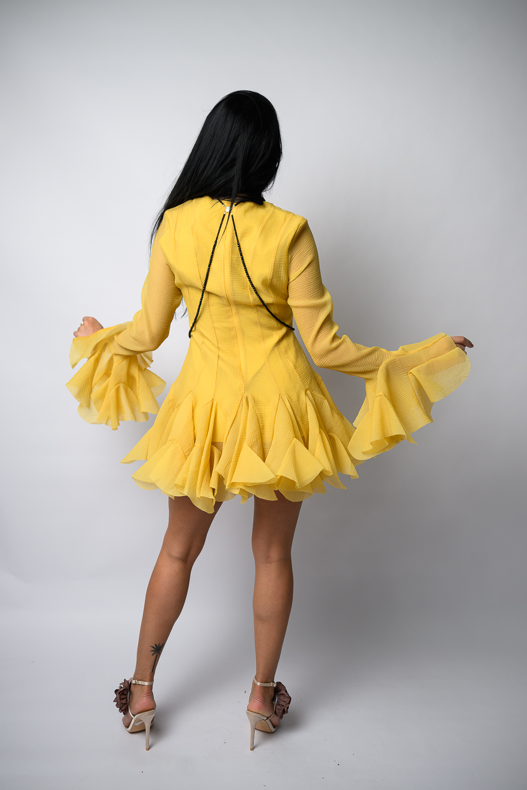 Rochia mini galbenă este piesa perfectă pentru apariții îndrăznețe și feminine. Realizată din material fluid cu textură fină, rochia impresionează prin mânecile ample tip cloș și volanele dinamice din partea inferioară.